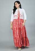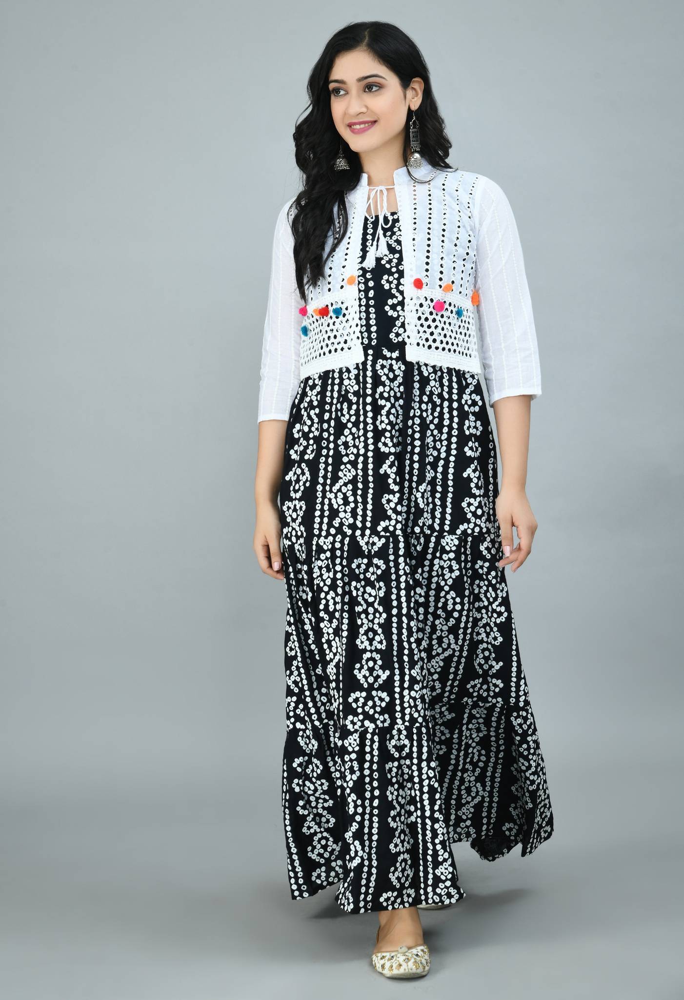 new arrivals fastive party wear rayon fabric bandhej print anarkali gown and chikankari work 3/4 selvee koti. this koti are so diffrant look this pis.