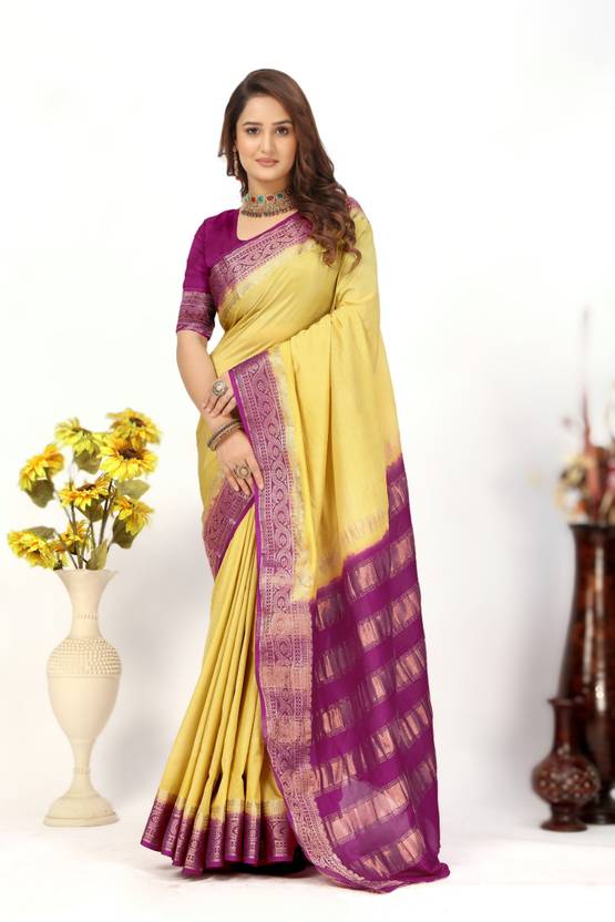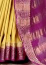 Add timeless elegance to your ethnic collection with this beautiful Mysore Crepe Silk Saree, designed for women who appreciate traditional charm with a graceful twist. This saree features a serene Wine & Yellow base adorned with a vibrant red border and pallu, intricately woven with gold zari motifs that enhance its regal appeal. The rich contrast and delicate checkered texture make it a perfect choice for festive and ceremonial occasions. Crafted from premium-quality Mysore crepe silk, this saree offers a soft, smooth texture with a lightweight drape that flows effortlessly, ensuring all-day comfort. It comes with an unstitched matching blouse piece in coordinating red, featuring complementary zari work to complete the elegant look. Whether it's a wedding, cultural event, or festive gathering, this saree delivers sophistication and poise with every wear. Easy to style and maintain, this Mysore silk saree is a versatile addition to any wardrobe. Pair it with statement jewelry and heels for a complete traditional ensemble that exudes class and grace.