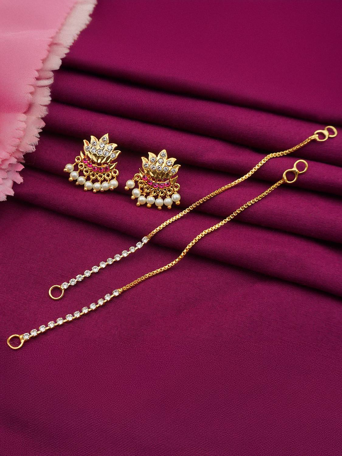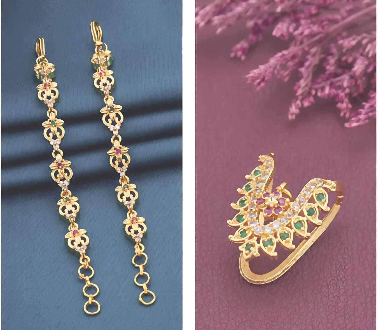 Jewelopia Love for Jewels by Desire Collection Presents Gold Plated Kaan Chain Silicon rubber transparent strechable Long Kansar Chain red and green Earrings For Women Girls. Stylish and Trendy gold plated long chain earrings from the Perfect for all occasions. All our Jewellery is Extreme Good quality, Anti allergic, High Silver Polish, rust and corrosion resistant. No lead or Nickel so it won’t irritate your skin. No Shisha hence light weight. The highest quality of Gold plating further ensures a long lasting shine. Instruction No direct Perfume Deo Chemicals on the Jewellery. It is advisable to store jewellery in an air tight container. First wear your makeup, perfume - then wear your jewellery. This Designer Pair of Ear chian Make You feel Like a Diva. Clean it with dry and soft cloth after wearing. This will keep your jewellery shining for years. Blessings Collection Gold Plated Kaan Chain transparent Long Chain Earrings For Women Girls.