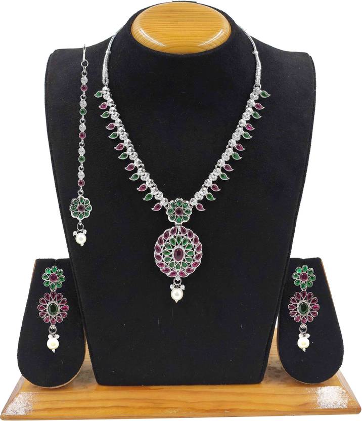 JEWELS HUB PRESENT BRASS MADE RHODIUM PLATED NECKLACE SET WITH EARRINGS AND MANG TIKA, LITE WEIGHT JEWELLERY, IT CAN BE WEAR IN ALL FUNCTIONS LIKE WEDDING ENGAGEMENT PARTY FSTIVAL ETC.