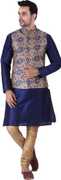 A kurta pajama paired with a Nehru jacket is a classic and stylish ensemble that blends traditional Indian attire with a touch of modern elegance. The kurta is a long, loose-fitting tunic that typically reaches below the knees. It is made from Dupuion SIlk Kurta Pajama and Satin Fabric used in Nehru Jackat. The pajama, also known as pyjama or churidar, is the bottom part of the attire. It is usually straight-cut and loose-fitting, providing comfort and ease of movement. Named after Jawaharlal Nehru, India's first Prime Minister, the Nehru jacket is a sleeveless, hip-length jacket. It is typically tailored with a mandarin collar that stands up straight, distinguishing it from Western-style jackets.Together, the kurta pajama with a Nehru jacket creates a polished and sophisticated appearance suitable for formal occasions such as weddings, festivals, or cultural events.