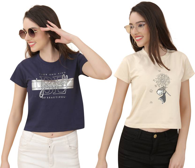 JH MART Pack of 2 Women Graphic Print Round Neck Pure Cotton Beige, Navy Blue T-Shirt