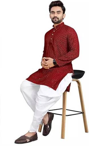 Lucknowi Kurta Dhoti Set Men's Mirror Work Chikan Chikankari Full Embroidery or Embroidered Kurta Full Premium Quality Schiffli works New Style Black Yellow Red Wine Maroon Rama Blue Navyblue Colour