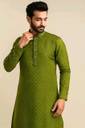 This Mehendi Green men’s straight kurta is crafted from premium Viscose Rayon fabric, known for its smooth texture, breathability, and elegant drape. Designed with a subtle self-design pattern, the kurta offers a classy and rich appearance suitable for both casual ethnic days and special festive events.