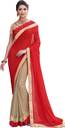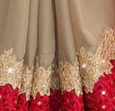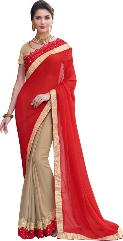 Jiya Presents Beige Color Multi Embroidered And Embellished Satin Chiffon Skirt & Red Color Chiffon Pallu Half & Half Saree With Unstitched Gota,Rawsilk Blouse Piece. Having Absolute Great Designs. Charming Color Combination Makes It More Able. Ideal For Parties And Festivals. Our Sarees Are Designed And Stitched Using High Grade Fabrics And Yarns Under The Strict Surveillance Of Our Well-Versed Designers. We Are Offering Our Sarees At Most Reasonable Prices.