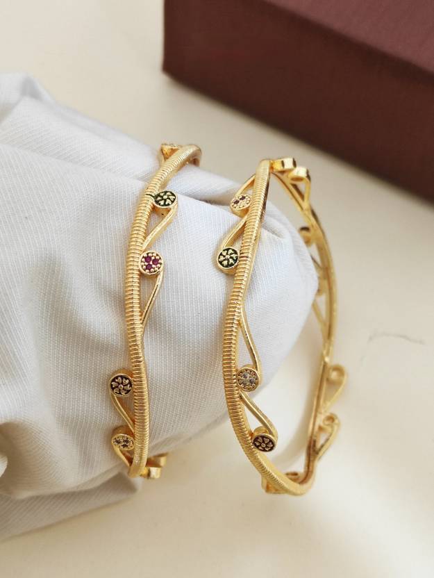 Hiyan Enterprise Trends Present new designer exquisite gold-plated bangles set. Crafted from tin and lead-free brass metal, these vibrant, Featuring Fine Intricated Gold Filgree Design, combining traditional and elegance for modern women. Get the elegant look by coupling this beautiful set of golden bangles with an ideal ethnic outfit.