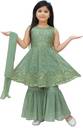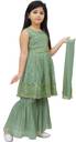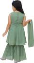 Dress your little girl in this elegant and stylish sharara set, tailored in soft georgette fabric for a graceful flow and all-day comfort. Featuring intricate embroidery on a flared sleeveless top, paired with matching pleated sharara bottoms and a dupatta, this outfit is perfect for weddings, festive events, and special occasions. The combination of traditional design and lightweight fabric makes it a charming ethnic ensemble.