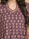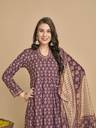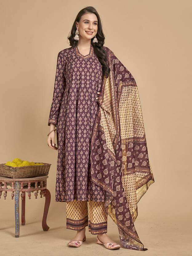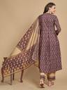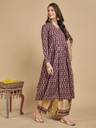 Get ready for a festive look this winter in this beautiful brown and beige printed anarkali cotton blend kurta set. The kurta has mandarin collar neck and three quarter sleeves with box pleated flare. It is coordinated with printed straight pants and printed organza dupatta.