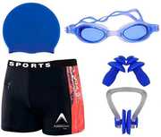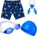 1 swimming costume for boys, 1 swimming cap for kids, 1 swimming goggles for kids, 1 set of ear plug and 1 nose clip for swimming