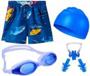 1 swimming costume for boys, 1 swimming cap for kids, 1 swimming goggles for kids, 1 set of ear plug and 1 nose clip for swimming