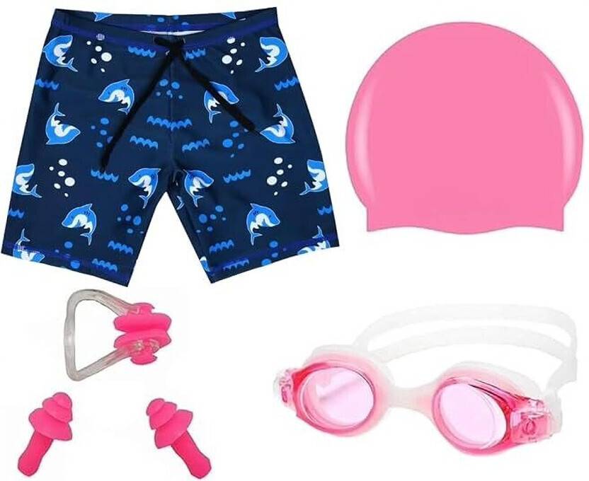 1 Swimming Shorts, 1 Anti Fog Swimming Goggles, 1 Silicone Swimming Cap, 1 Nose Clip, 2 Ear Plugs
