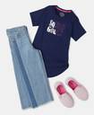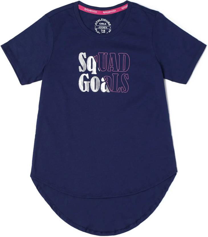 Jockey AG70 Girl's Super Combed Cotton Graphic Printed Short Sleeve T-Shirt with Hi Low Hem - Imperial Blue. Sporting style meets loungewear with the Athleisure Juniors Collection. Ready for endless days of fun, games and any exciting adventure that you might be up to. These bright and colourful styles offer unmatched comfort for stay-at-home days as well as those spent exploring the world. 100% Super Combed Cotton Fabric ,Fabric Composition : Cotton ,Relaxed Fit ,Round Neck ,Hi Low Styling ,Label Free for All Day Comfort. Gentle wash 30C, Do not bleach, Do not wring, Line dry in shade, Low iron on reverse, Low iron on reverse, Do not dry clean, Wash inside out with like colours. Do not iron on label.