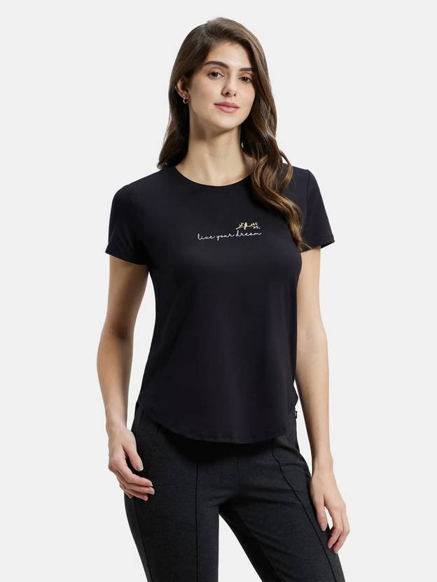 Jockey IW31 Micro Modal Fiber Elastane Stretch Relaxed Fit Graphic Print Round Neck Half Sleeve T-Shirt With Curved Hem Styling - Black. Exquisitely soft and elegantly sleek -the International Collection exhibits beautiful craftsmanship, using only the finest materials. This range is for the woman who won? settle for anything less, inside or out. Micro Modal Cotton Elastane Stretch Fabric ,Fabric Composition : Environment Friendly Micro Modal Fiber, Cotton and Elastane ,Relaxed Fit ,Curved Hem Styling ,Round Neck ,Half Sleeve ,Label Free for All Day Comfort. Gentle wash 30C, Do not bleach, Do not wring, Tumble dry low, Low iron on reverse, Low iron on reverse, Do not dry clean, Wash inside out with like colours, Do not iron on label/print, This product comes in a variety of Prints. The Print shown here is for representation purpose. The product delivered may not be of the same pattern.