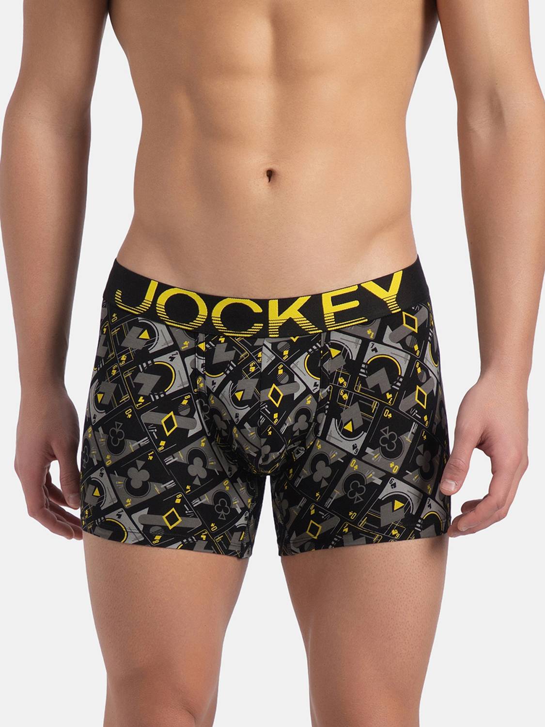 Jockey FP23 Super Combed Cotton Elastane Stretch Printed Trunk with Ultrasoft Waistband - Black Empire Yellow. Bright neon colours dominate this range with designs that wont be missed from a mile away. The Pop Colour Collection is tailor made for the man who marches to the beat of his own drum. Super Combed Cotton Elastane Stretch Fabric, Fabric Composition : Cotton and Elastane, Engineered to Prevent Ride Up, Ultrasoft and Durable Waistband, All Over Print Design, Label Free for All Day Comfort. Gentle wash 40C, Do not bleach, Do not wring, Tumble dry low, Do not iron, Do not dry clean, Wash inside out with like colours. This product comes in a variety of Prints. The pattern shown here is for representation purpose. The product delivered may not be of the same pattern/print.
