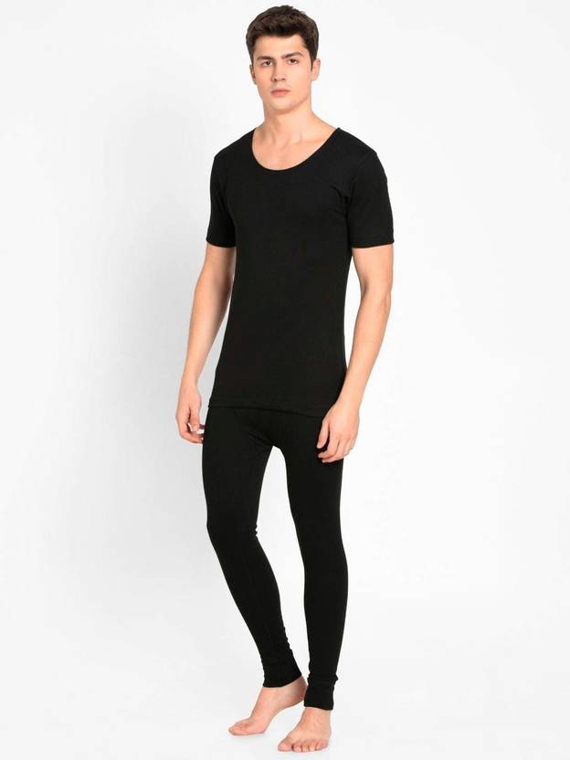 Jockey Men Black Round Neck Half Sleeves Undershirt & Trouser Thermal Set- Pack of 1. Fabric Details : 56% cotton , 23% viscose, 21% polyester.Premium Combed Cotton rich “BRUSHED INTERLOCK” fabric.Snug, tailored fit. Blind reinforced seams. Low neck design. Upper & Lower Thermal Set.