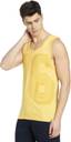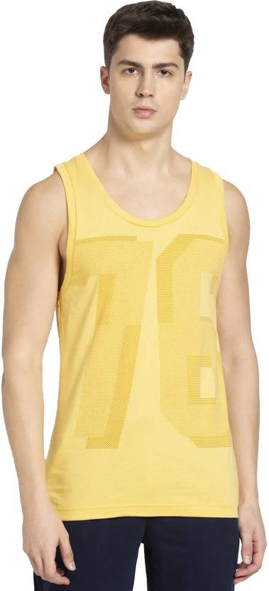 Athleisure Men Printed CornSilk Round Neck Sleeveless Tank Top (Vest) - Pack of 1 (#9928). Material Composition : 80% Cotton, 20% Polyester. Super combed Cotton Rich fabric with graphic print design. Deep round neckline & armhole for extra comfort. Regular fit. Label free for all day comfort.