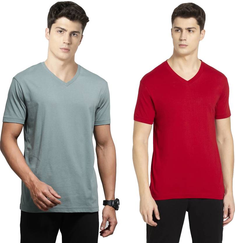 JOCKEY Pack of 2 Men Solid V Neck Pure Cotton Green, Red T-Shirt