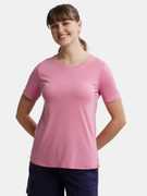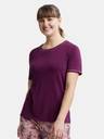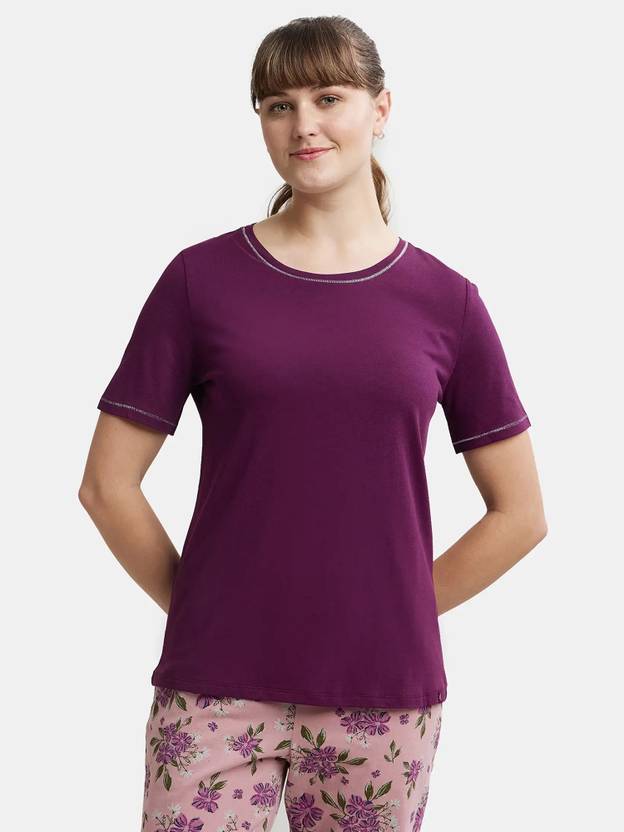 Jockey RX71 Micro Modal Cotton Relaxed Fit Round neck Half Sleeve T-Shirt - Purple Wine. The Relax Collection is the pinnacle of comfort -created for lazy Sunday mornings and quiet Friday evenings. Each piece in this selection is made from super-soft fabrics, and is the best fit for the woman who? ready to kick back, relax, and have a good time. Micro Modal Cotton Fabric ,Fabric Composition : Environment Friendly Micro Modal Fiber and Cotton ,Relaxed Fit ,Round Neck ,Short Sleeve ,Lurex Styling on Neck and Sleeves ,Label Free for All Day Comfort. Gentle wash 30C, Do not bleach, Do not wring, Tumble dry low, Low iron on reverse, Low iron on reverse, Do not dry clean, Wash inside out with like colours, Do not iron on print,