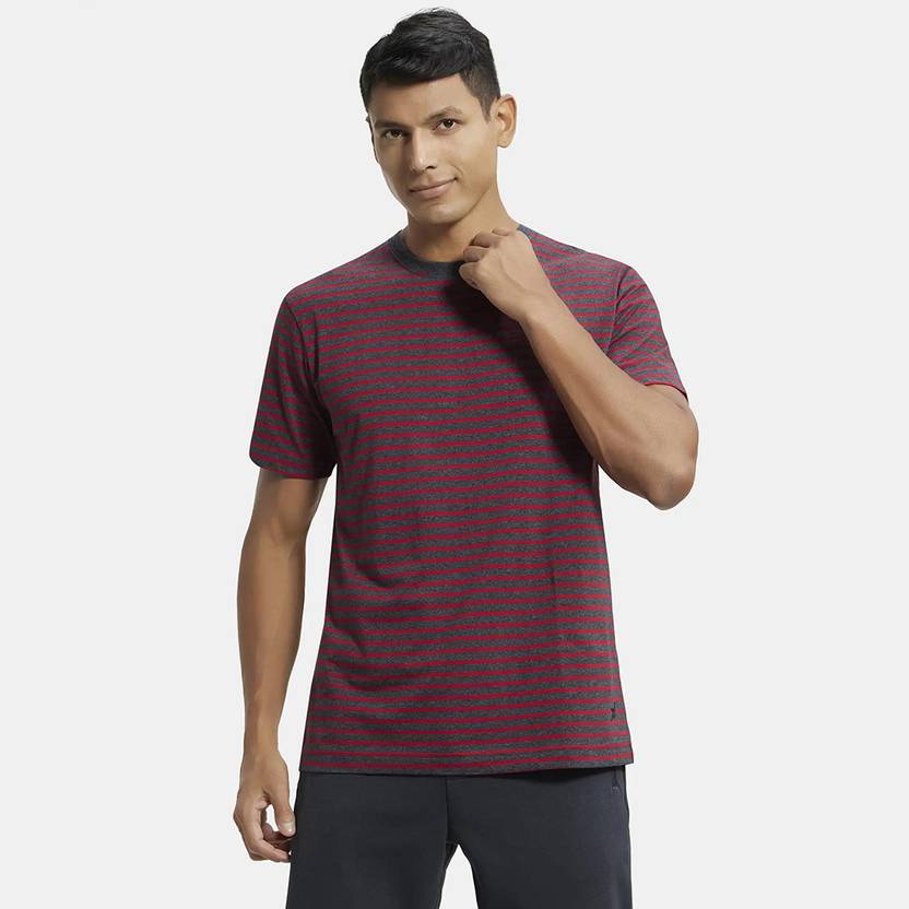 Jockey 2715 Super Combed Cotton Rich Striped Round Neck Half Sleeve T-Shirt - True Black & Shanghai Red. Created with just the right blend of functionality, style, and comfort, the Athleisure Collection is the perfect fit for workouts, travel, or just a relaxing night in. This range is designed for the man who? always on the go Super Combed Cotton Rich Fabric ,Fabric Composition : Cotton and Polyester ,Round Neck ,Half Sleeve ,Label Free for All Day Comfort. Gentle wash 40C, Do not bleach, Do not wring, Tumble dry low, Medium iron, Medium iron, Do not dry clean, Wash inside out with like colours. Iron on reverse/do not iron on label/print.