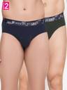 Pack of 2 classic briefs in dark green and navy, crafted from ultra-stretchy cotton spandex fabric, offering freedom of movement and lasting comfort. Both of them are designed with camouflage print elastic and feature the John Player logo at the centre. They feature a double-layered contoured crotch and have a super-soft elastic that provides a rash-free snug fit.