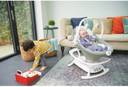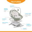 Rock stop foot flips down to halt rocking motion, A/C power adapter or battery operated, Toy bar with two plush toys, Soothing vibration, 5 nature sounds and 5 lullabies, Cocooned shaped seat with machine washable infant body insert and head support