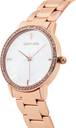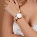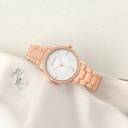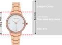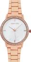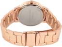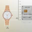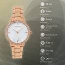 This contemporary charmer is an elegant style companion in daily life and on special occasions. Its 31.5 mm case is delicate and refined. It features a patterened white dial with circle of tiny rhinestones on the case that enhances the overall look, and a chic rose gold metallic link strap. For all your evening looks, this time piece is right pick!