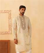 Cream and Gold Sequins Embroidered Mandarin collar Long, Regular sleeves Straight shape with regular style Thread work detail Knee length with straight hem Machine weave regular silk Blend