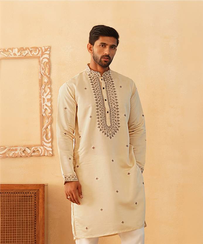 Men Embroidered Cotton Silk Straight Kurta (Beige)
