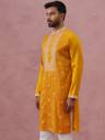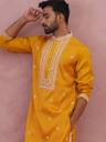 Crafted from a luxurious silk-blend fabric, this kurta features detailed embroidery along the neckline and placket, adding a royal touch to its modern silhouette. Comfortable, stylish, and festive—perfect for weddings, rituals, and cultural festivities.
