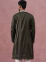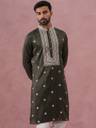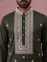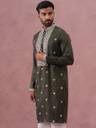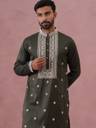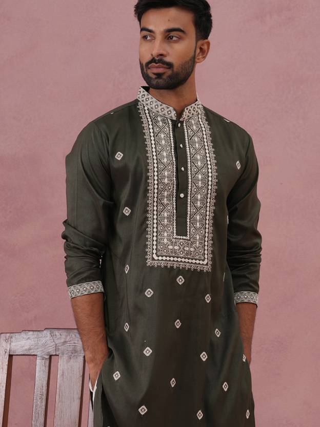 Crafted from a luxurious silk-blend fabric, this kurta features detailed embroidery along the neckline and placket, adding a royal touch to its modern silhouette. Comfortable, stylish, and festive—perfect for weddings, rituals, and cultural festivities.