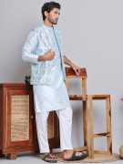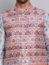 Blue Printed Nehru Jacket & Kurta Set, Blue straight knee length kurta, has a mandarin collar, long sleeves, straight hem, White solid churidar, drawstring closure,