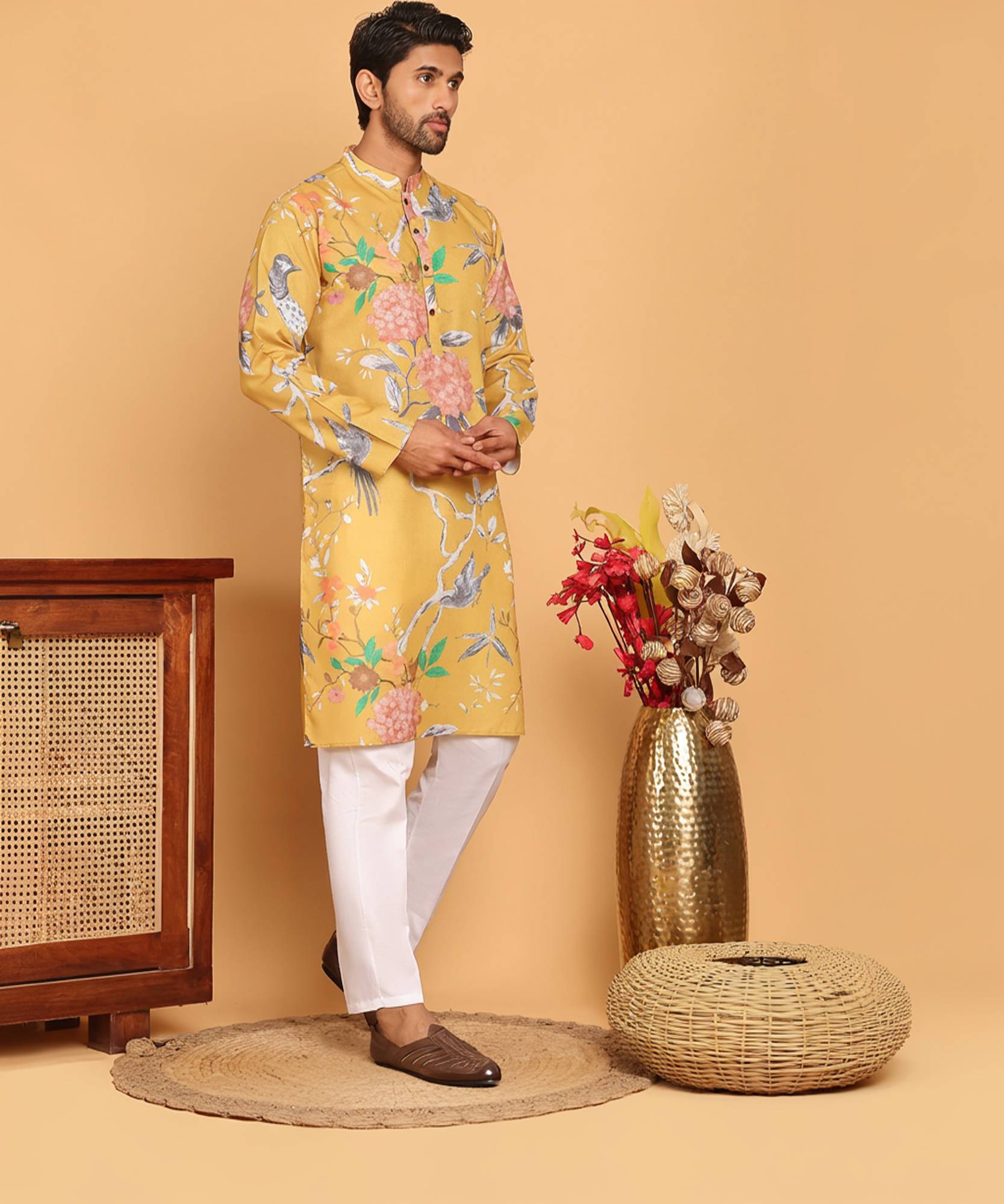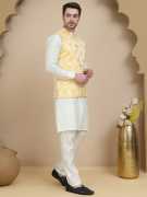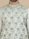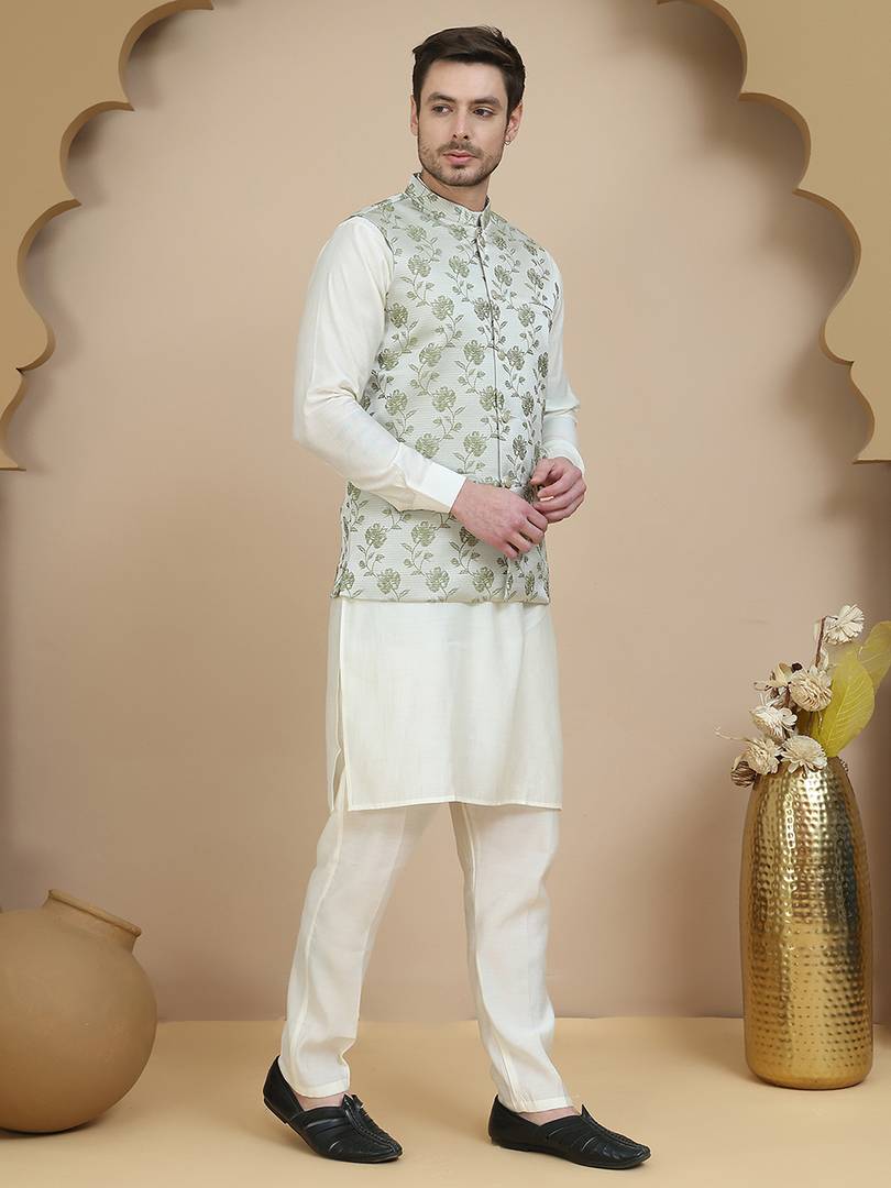 this classy Off White kurta set, paired with a striking Green embossed Nehru jacket featuring a subtle floral pattern. Crafted from premium fabric for a sleek silhouette,Ideal for festive occasions, weddings, and cultural celebrations,