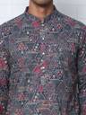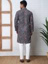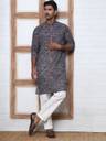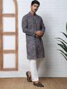 Grey Printed and Embroidered Cotton kurta with Pyjama, Grey straight knee length kurta, has a mandarin collar, long sleeves, straight hem, side slits, White solid Pyjama, drawstring closure