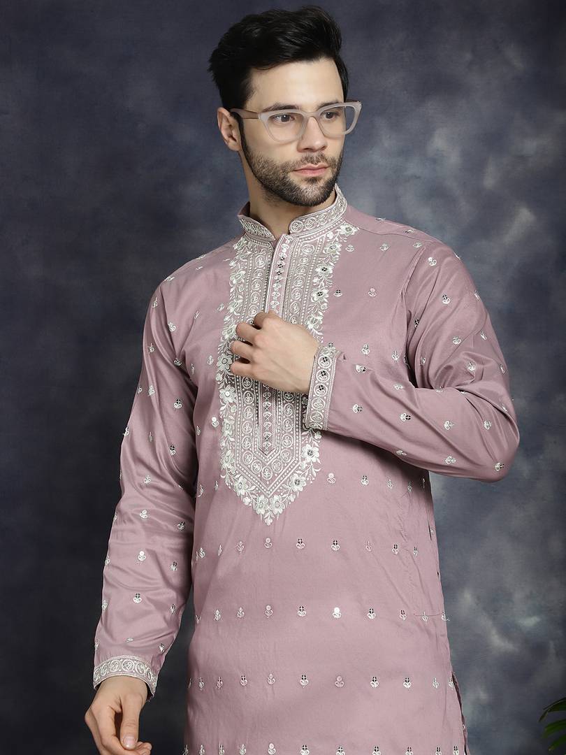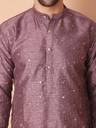 Purple Mirror Work Silk Blend Kurta with Pyjamas, Purple Straight knee length kurta, has a mandarin collar, long sleeves, Straight hem, White solid pyjamas, drawstring closure