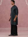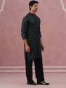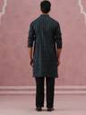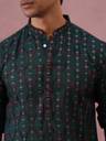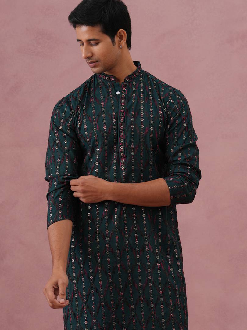 This Olive silk-blend kurta pyjama set showcases elegant all-over embroidery in vertical motif patterns, giving it a refined and festive appeal. Designed with a mandarin collar and comfortable fit, it’s ideal for celebrations, events, and traditional gatherings. Pair it with classic mojaris for a complete ethnic look.