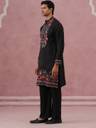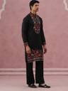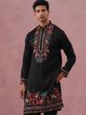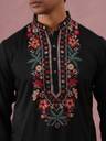 Crafted from a lustrous cream silk blend, this straight-cut kurta features intricate floral embroidery on the mandarin collar, cuffs, and hemline. The vibrant multi-color thread work contrasts beautifully against the fabric's sheen, making it a regal choice for festive occasions."