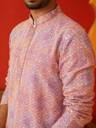 Pink Sequins & Embroidered Kurta Pyjama Set, Pink straight above knee kurta, has a mandarin collar, long sleeves, straight hem ,White solid Pyjama, drawstring closure