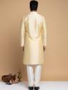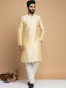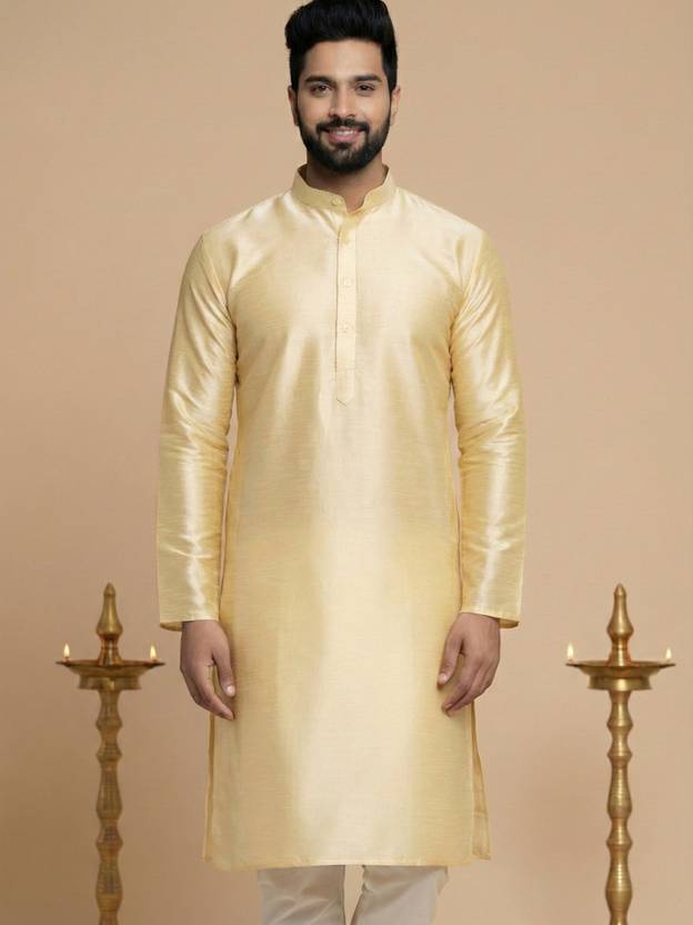 Gold solid Dupion Silk kurta with churidar, Gold straight knee length kurta, has a mandarin collar, long sleeves, straight hem, Off-White solid churidar, drawstring closure