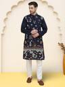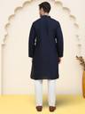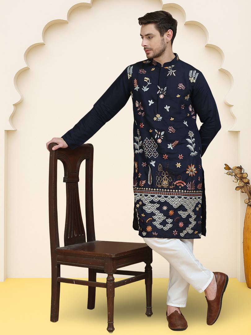 Navy Blue Men Kurta set, has a, Mandarin Collar collar, Straight Knee Length Kurta