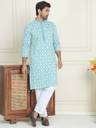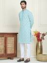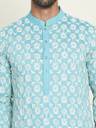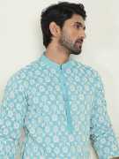 Blue embroidered knee length kurta Set, has a mandrin collar, long sleeves,Button closure, straight hem and side slits.Wear it in parties,traditional functions and festive occasion,White solid churidar, drawstring closure