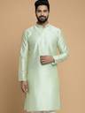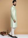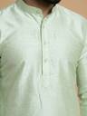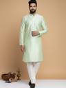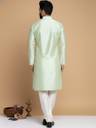 Green solid Dupion Silk kurta with churidar, Green straight knee length kurta, has a mandarin collar, long sleeves, straight hem, Off-White solid churidar, drawstring closure