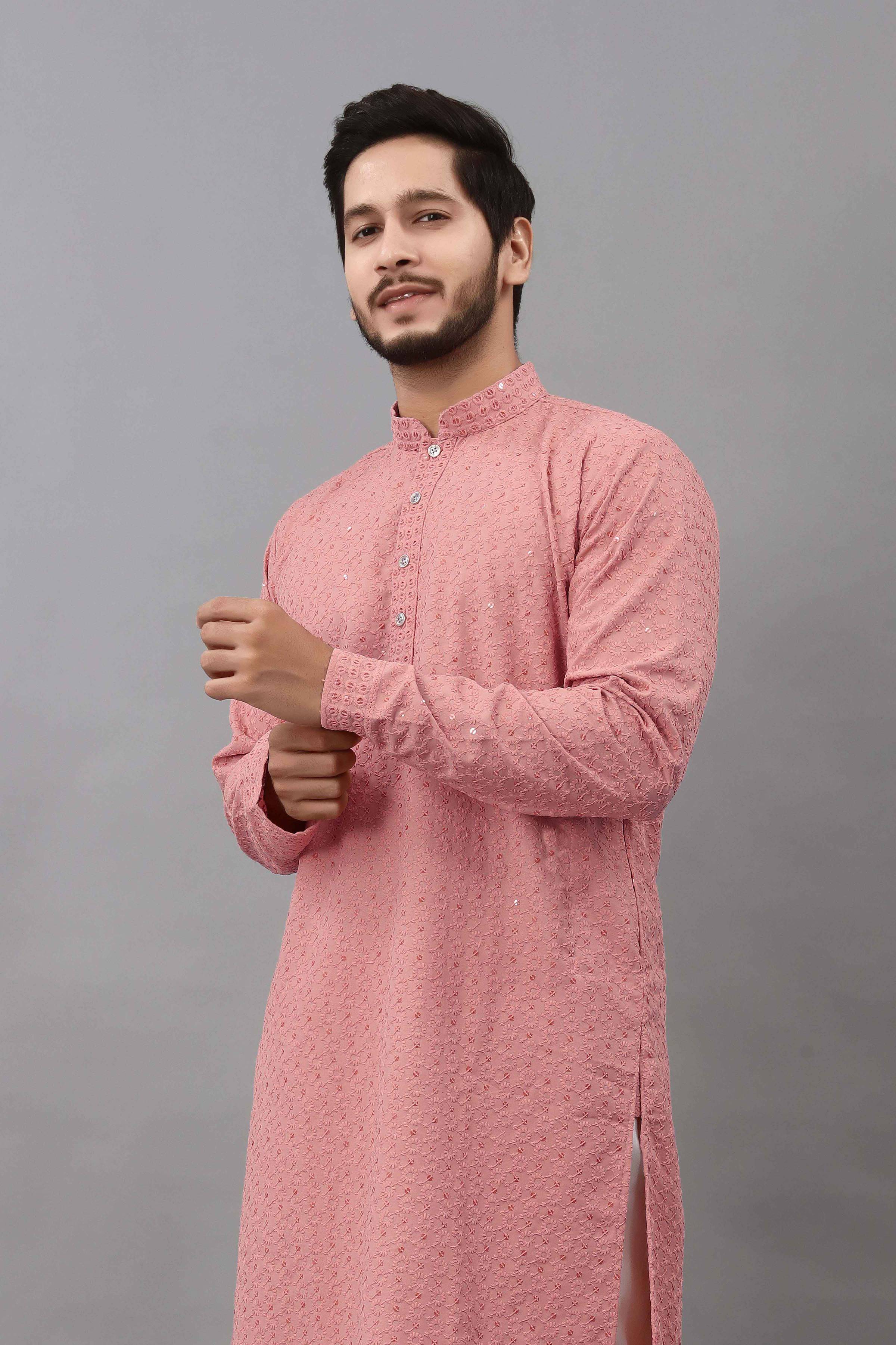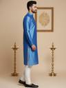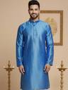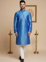 Blue solid Dupion Silk kurta with churidar, Blue straight knee length kurta, has a mandarin collar, long sleeves, straight hem, Off-White solid churidar, drawstring closure