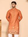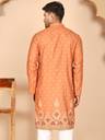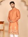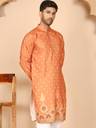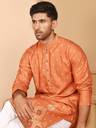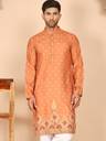 This elegant Orange kurtas featuring intricate all-over print and a striking forest motif border showcasing deer and tree patterns. the kurta comes with a mandarin collar, button placket, and full sleeves. Paired with a crisp white pyjama, this set is perfect for festive occasions