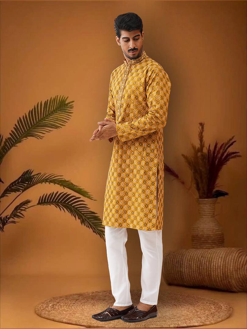 Jompers Men Printed Pure Cotton Straight Kurta (Yellow)