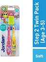 Step 2 for 3-5 years by jordan is the gentle oral care tool for your child aged 3-5 years. Exciting cartoon characters and colors make this brush add excitement and joy to the daily brushing routine. The sensitive bristles are made especially to be kind to and protect the milk teeth of your little one. Blue bristles in the centre indicate the right amount of toothpaste you should give your child.the handle of the brush is made with a fabulous finger-insert grip and is rounded oblong good and kind for the palm of your little one. It is good enough for the grip of parents as well as the child. The bristles are made with superior quality, non-toxic nylon of very high quality and durability. This imparts firmness to the bristles in spite of being kind and gentle to the gums of your little one.jordan step 2 comes with a hygiene cap - good for storage, travel and care of your little one's soon to be favourite toy.jordan is a 175 years old premium brand of oral care and dental hygiene from norway. With award winning designs, innovations and patents to its name, the company has been in the forefront of innovations. Today jordan is one of the world?s most exciting personal care and cleaning brands in the world with it's wide range of consumer centric products in dental hygiene and oral care.