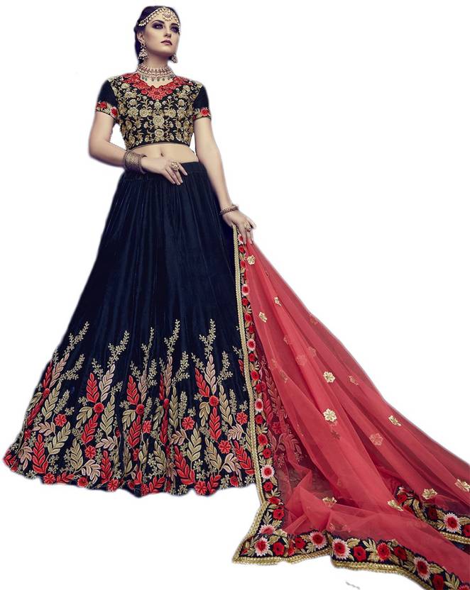 Get Ready For The Next Wedding Wearing This Designer Lehenga Choli In Navy Blue Color Paired With Contrasting Pink Colored Dupatta. Its Blouse And Lehenga Are Fabricated On Rich Velvet Paired With Net Fabricated Dupatta. It Has Contrasting Embroidery Which Will Give An Attractive Look To Your Whole Attire.
