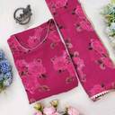 This set boasts a georgette fabric with a crepe lining, combining a slightly textured surface with a smooth inner layer. The georgette fabric offers a soft, flowing drape that complements the printed details, while the crepe lining adds gentle structure and helps minimise transparency. This dual-layer composition not only helps maintain the intended drape but also ensures comfort against the skin.