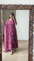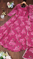 Thanks to its beautifully stitched format, the Anarkali-style gown in this set creates a graceful, flowing flare. Its classic round neckline enhances the elegance of the silhouette, ideally complementing the voluminous skirt. The long sleeves are tailored to rest comfortably, providing both coverage and a pleasing proportion. This overall design exudes poise while allowing unrestricted wear, with the coordinating and flexible dupatta completing this outfit.