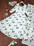 Sporting a comfortable neckline, long sleeves, and an Anarkali style, the gown in this set offers an elegant and timeless look. The neckline adds to the simplicity of this gown, while the long sleeves provide comfort and a classic silhouette. The Anarkali flair gives it a graceful flow, ensuring it flatters the body in a modest yet stylish manner. Additionally, the dupatta adds versatility to this outfit while complementing the gown.