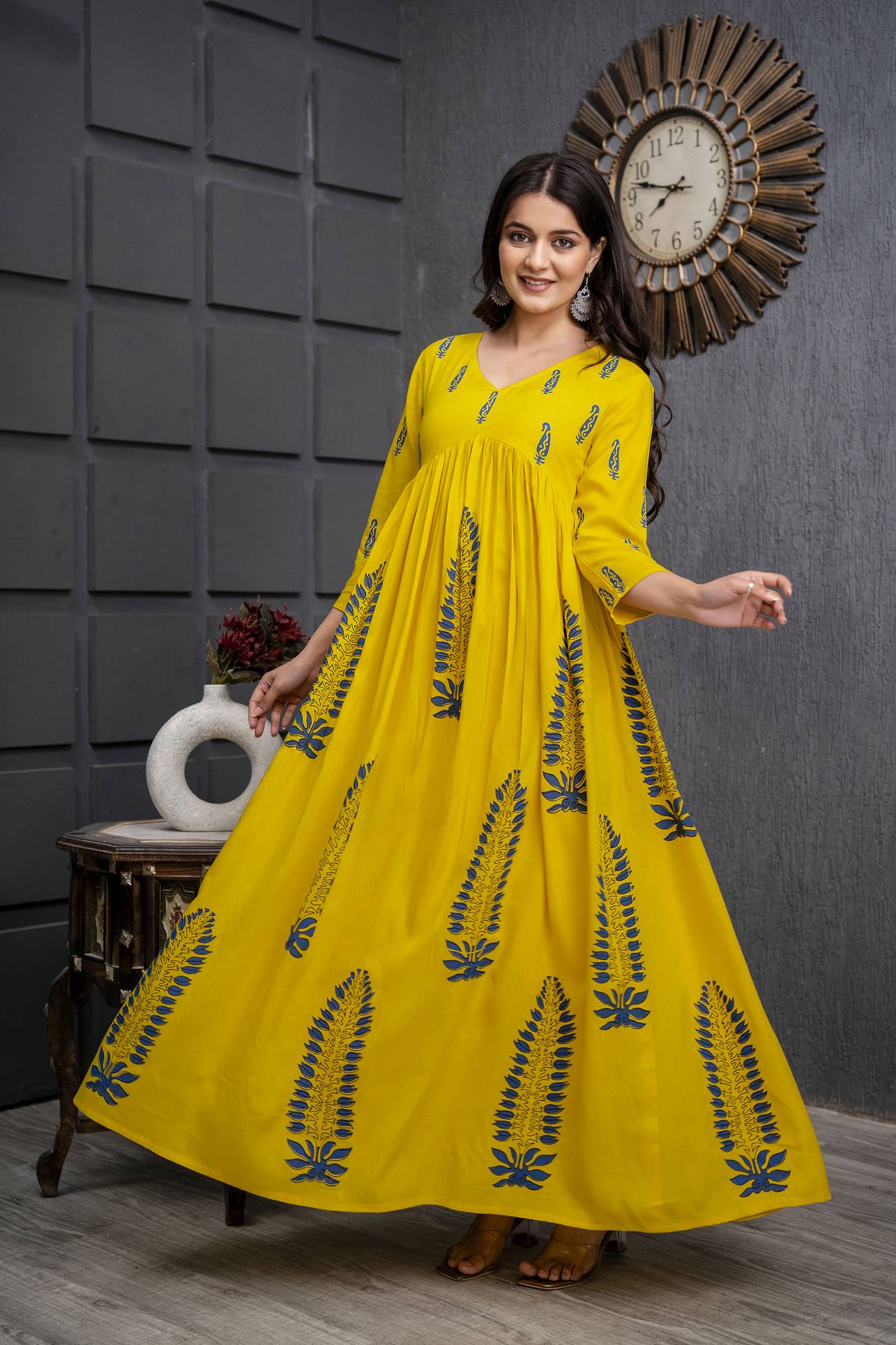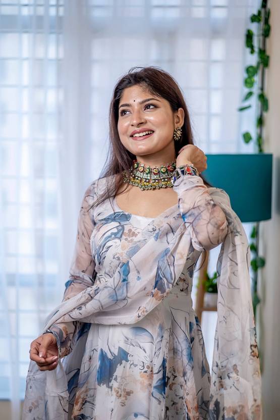 Crafted in premium lightweight georgette and paired with a soft crepe lining, this gown brings comfort with elegance. The pastel floral print in soothing white and blue tones gives a refreshing charm, while the flared Anarkali cut enhances the flowy silhouette. Finished with a matching dupatta, this outfit is perfect for festive celebrations, parties, and wedding functions.